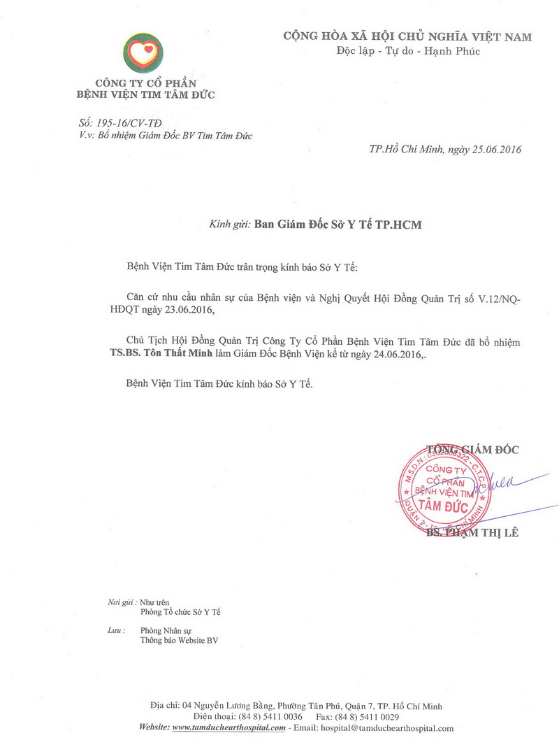 Thông báo bổ nhiệm giám đốc Bệnh viện Tim Tâm Đức