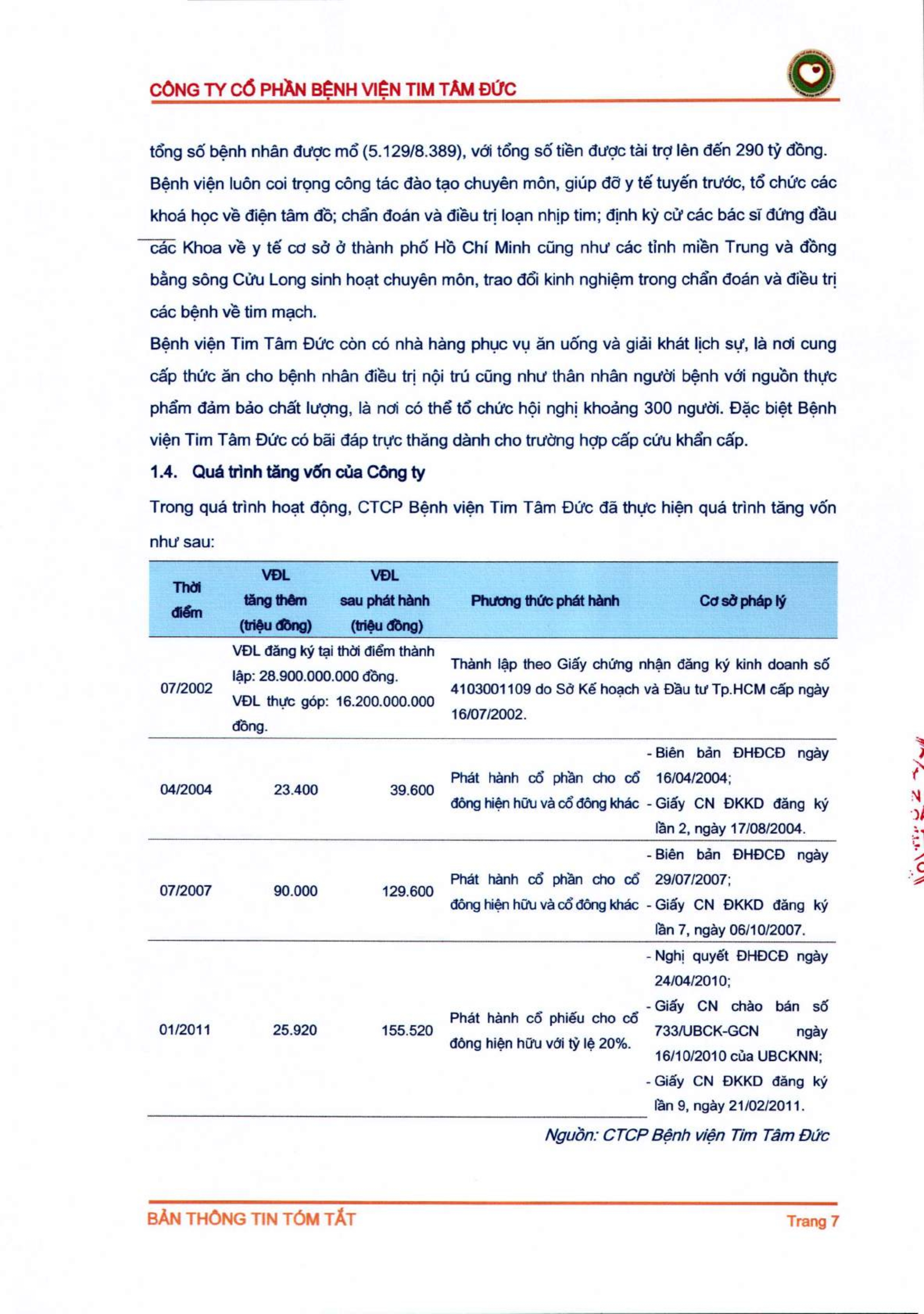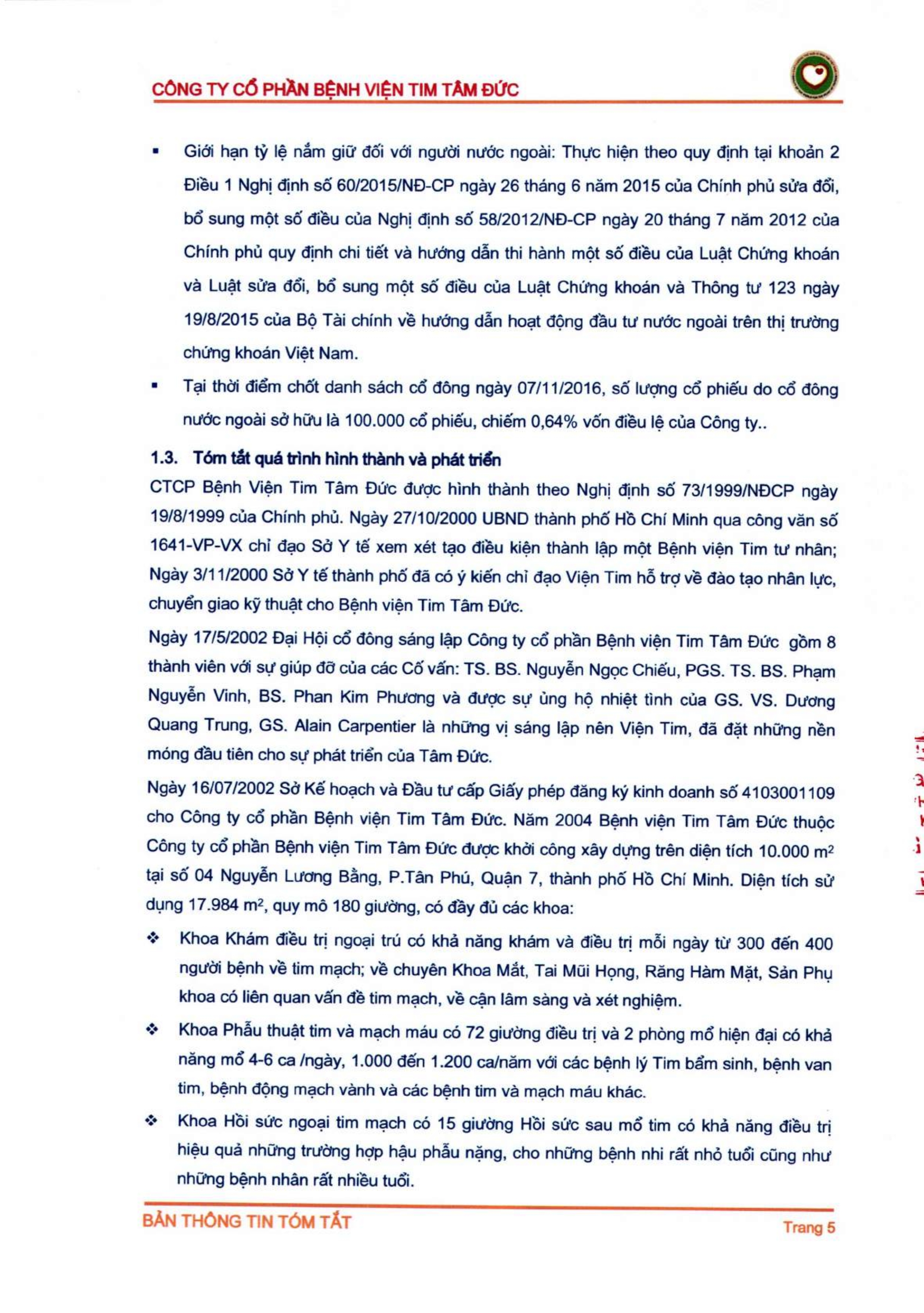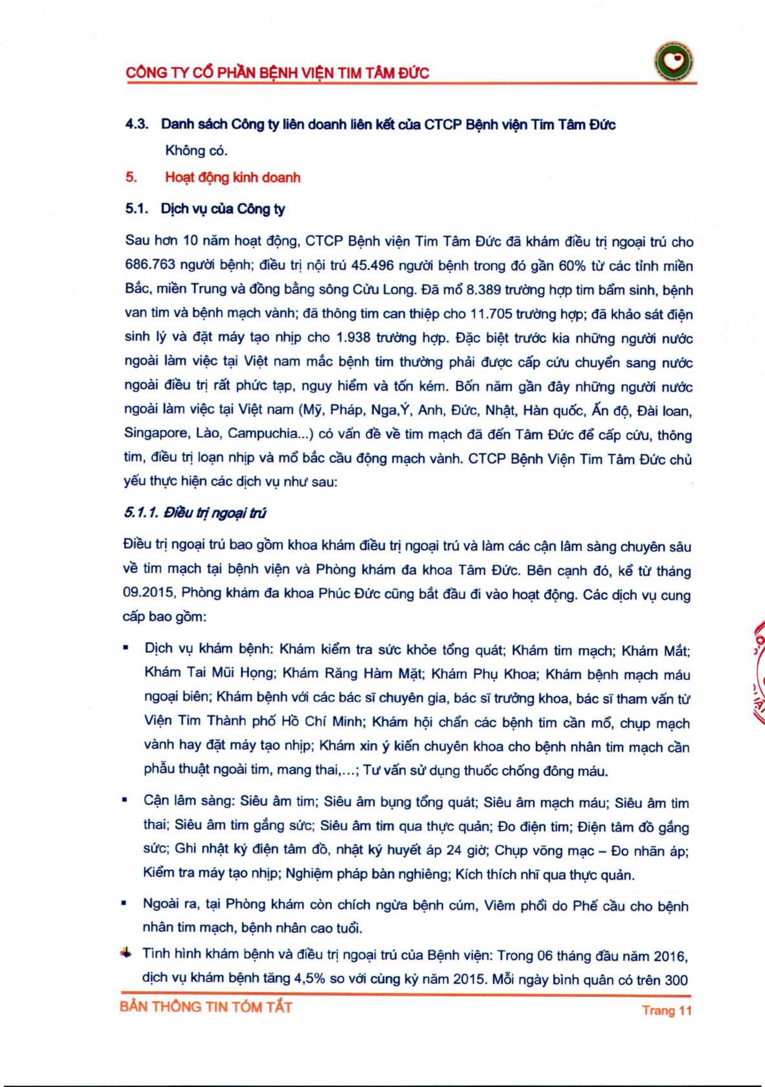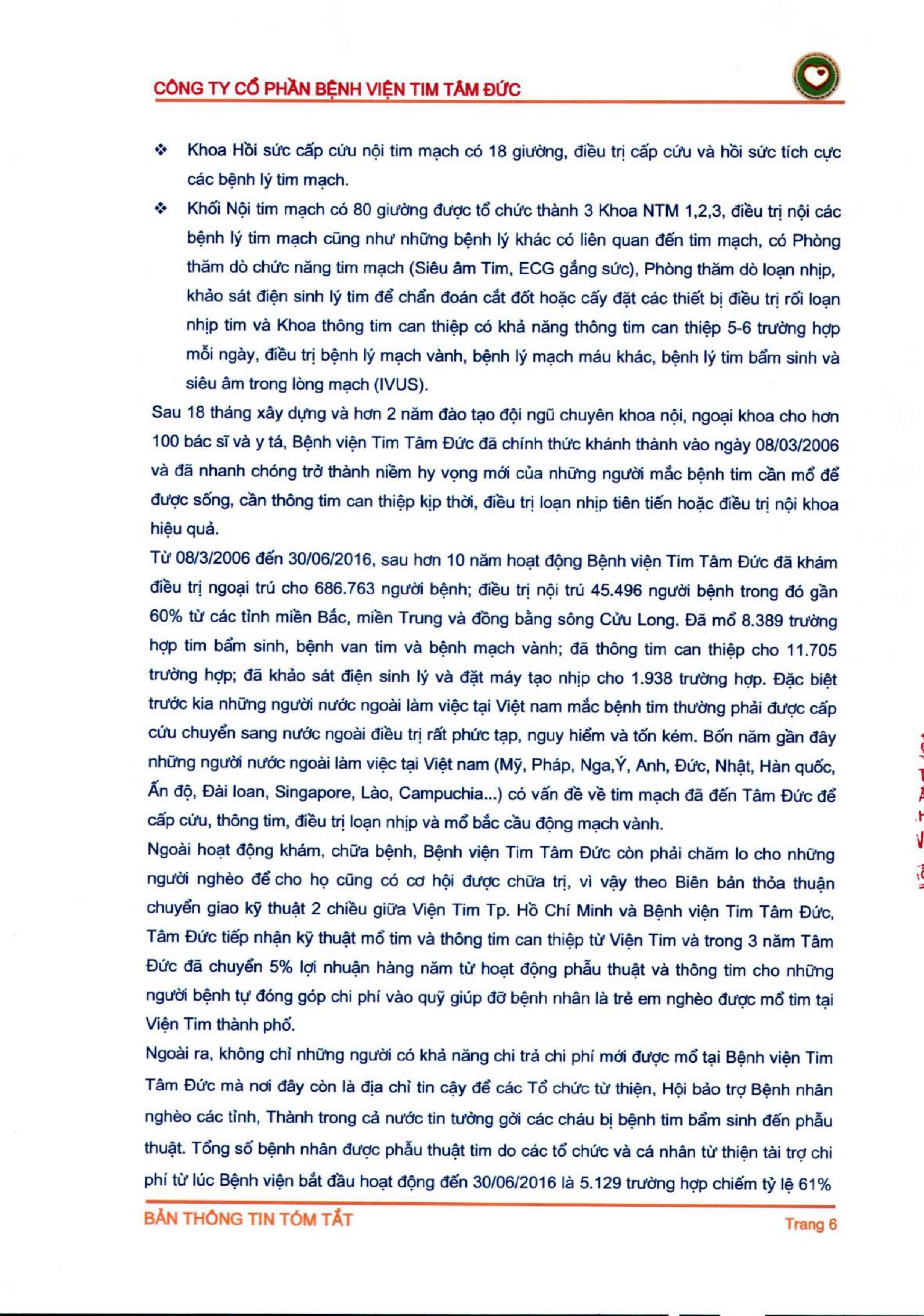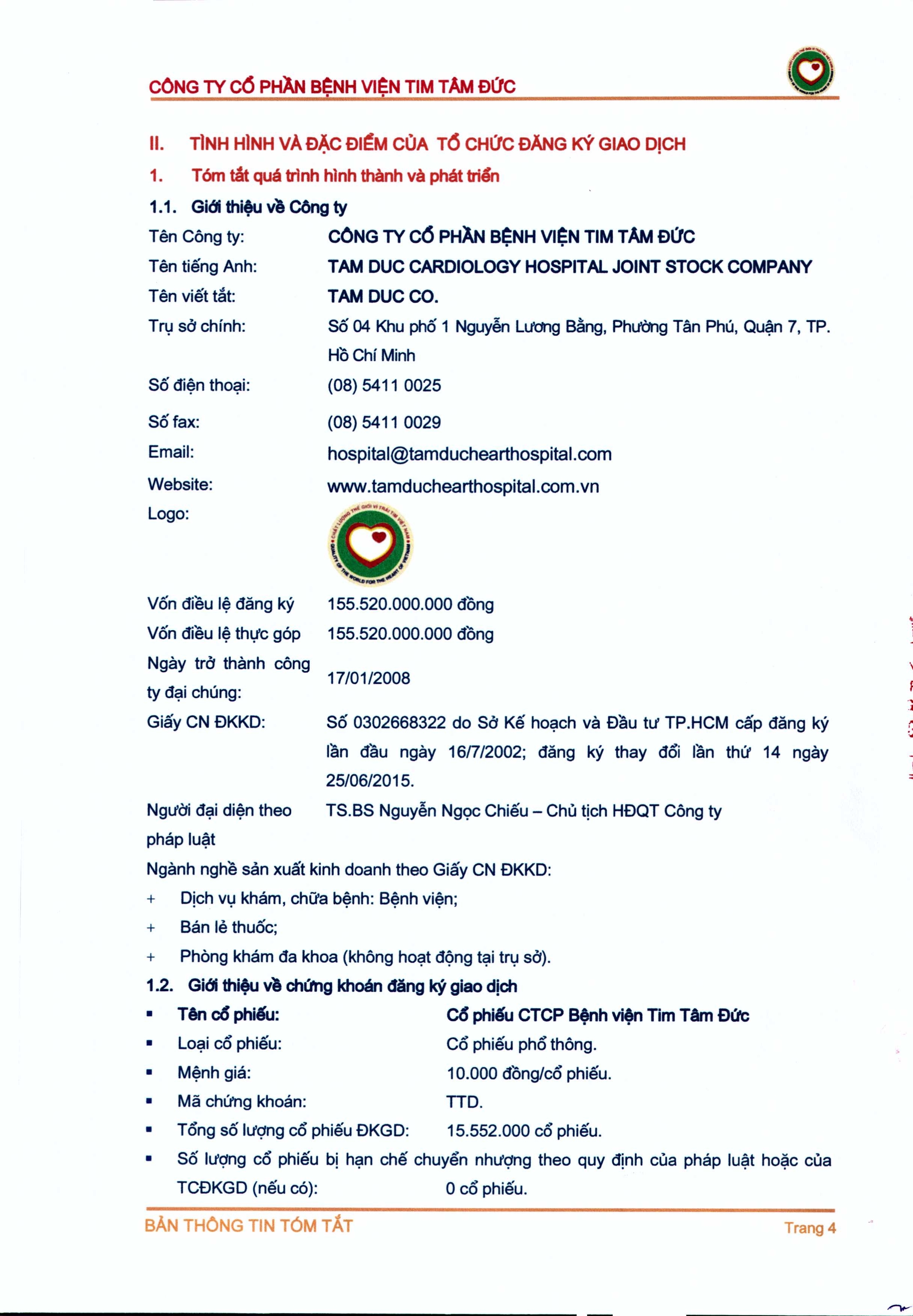 Thông tin tóm tắt về tổ chức đăng ký giao dịch Công ty CP Bệnh viện Tim Tâm Đức
