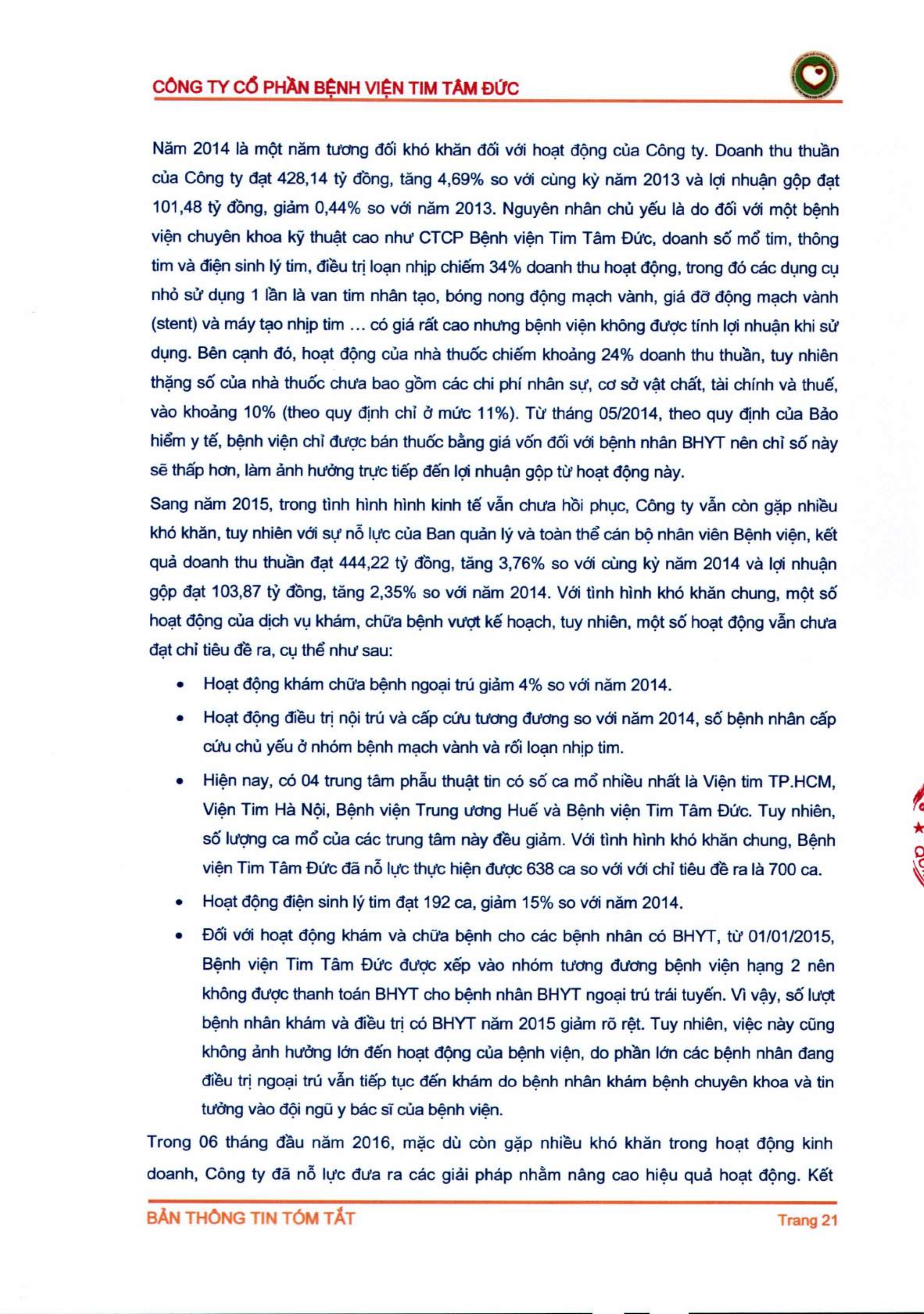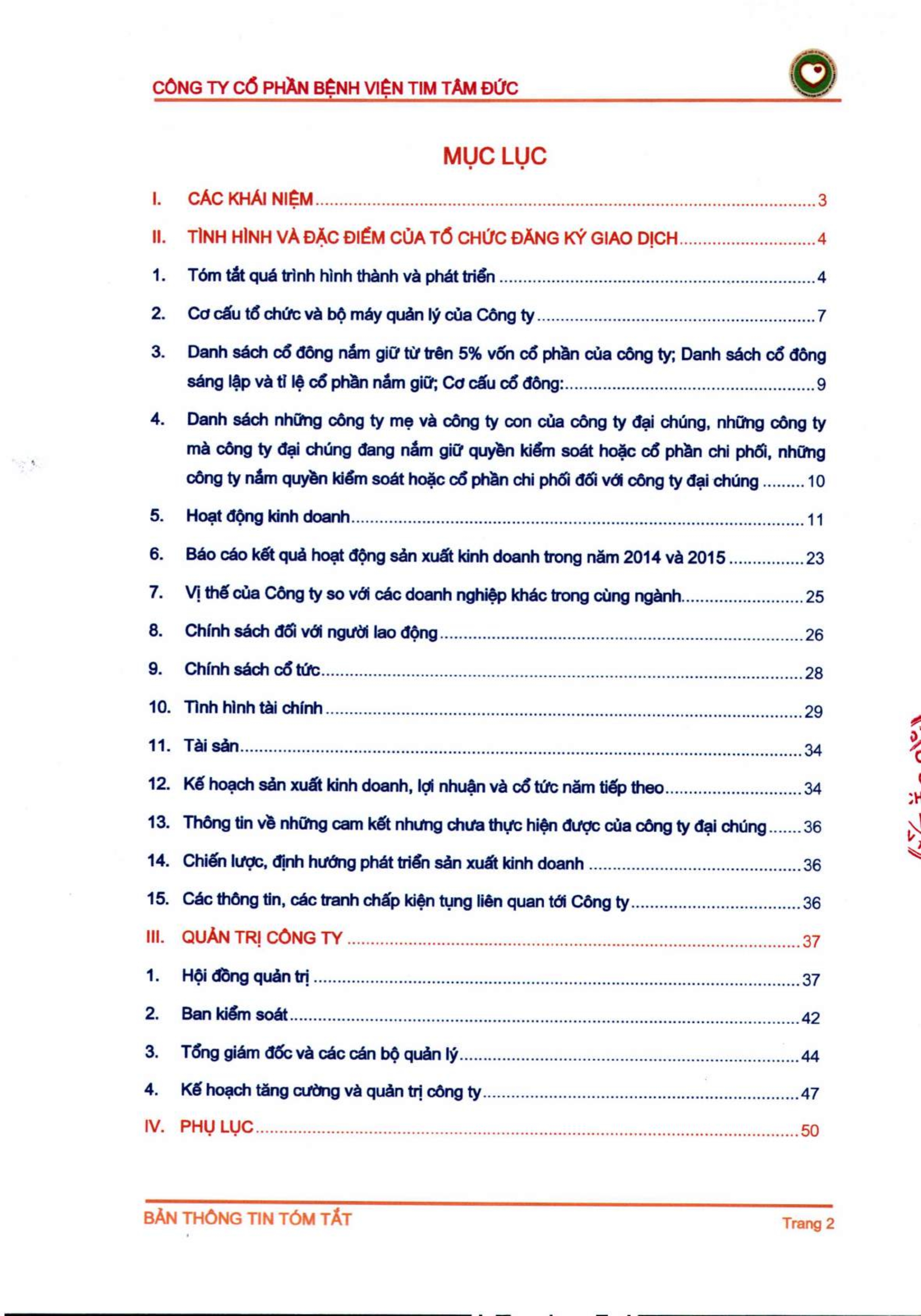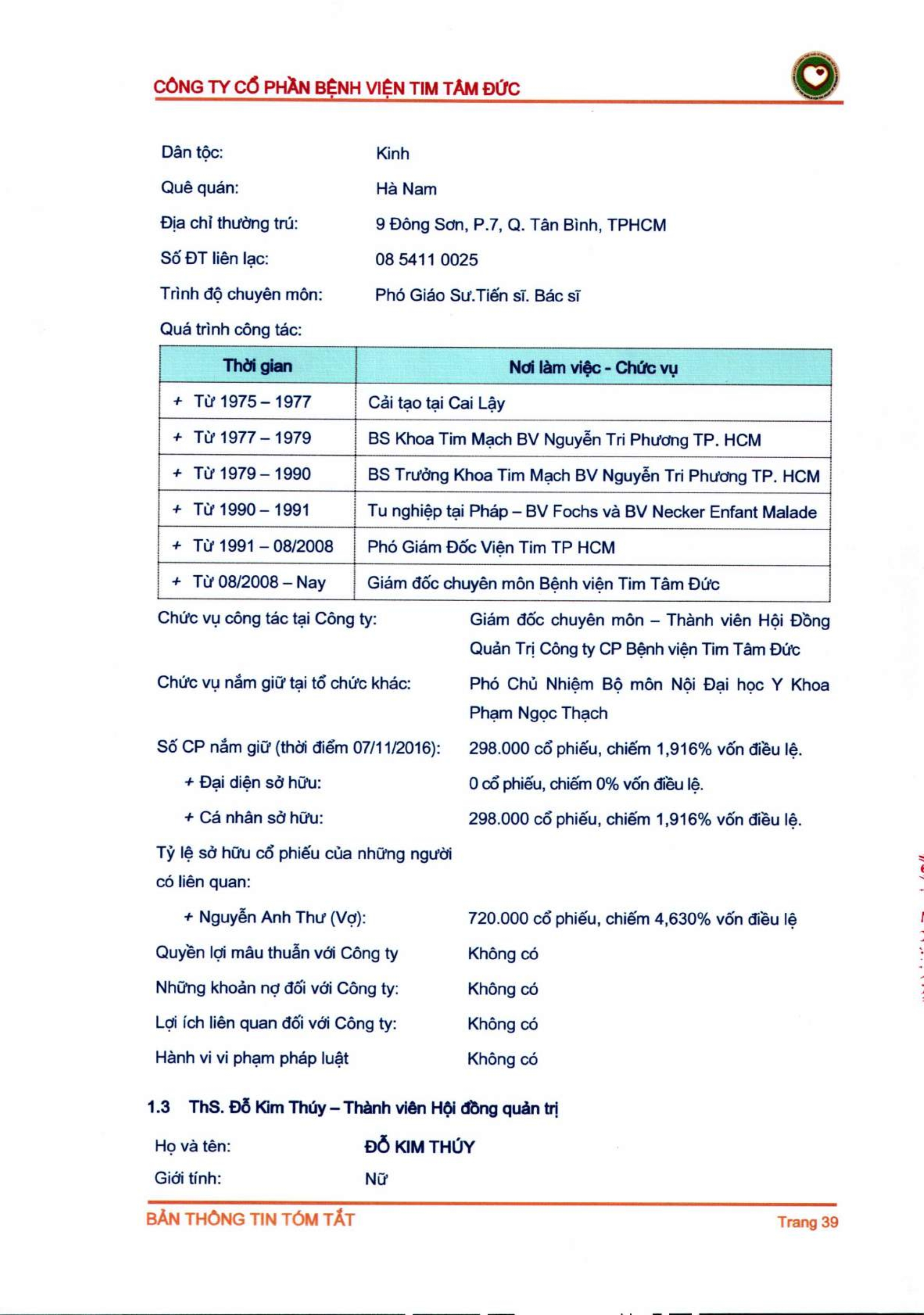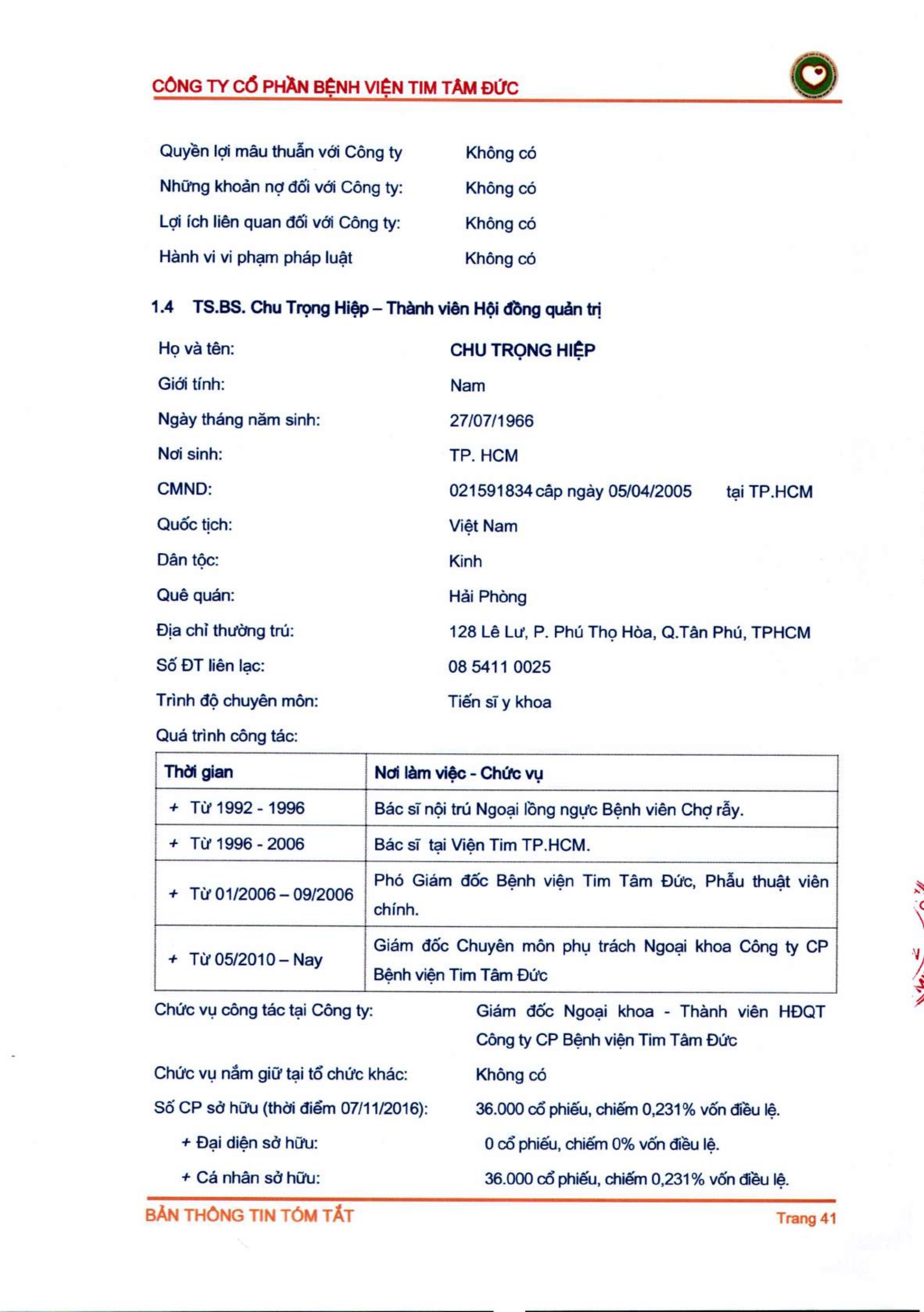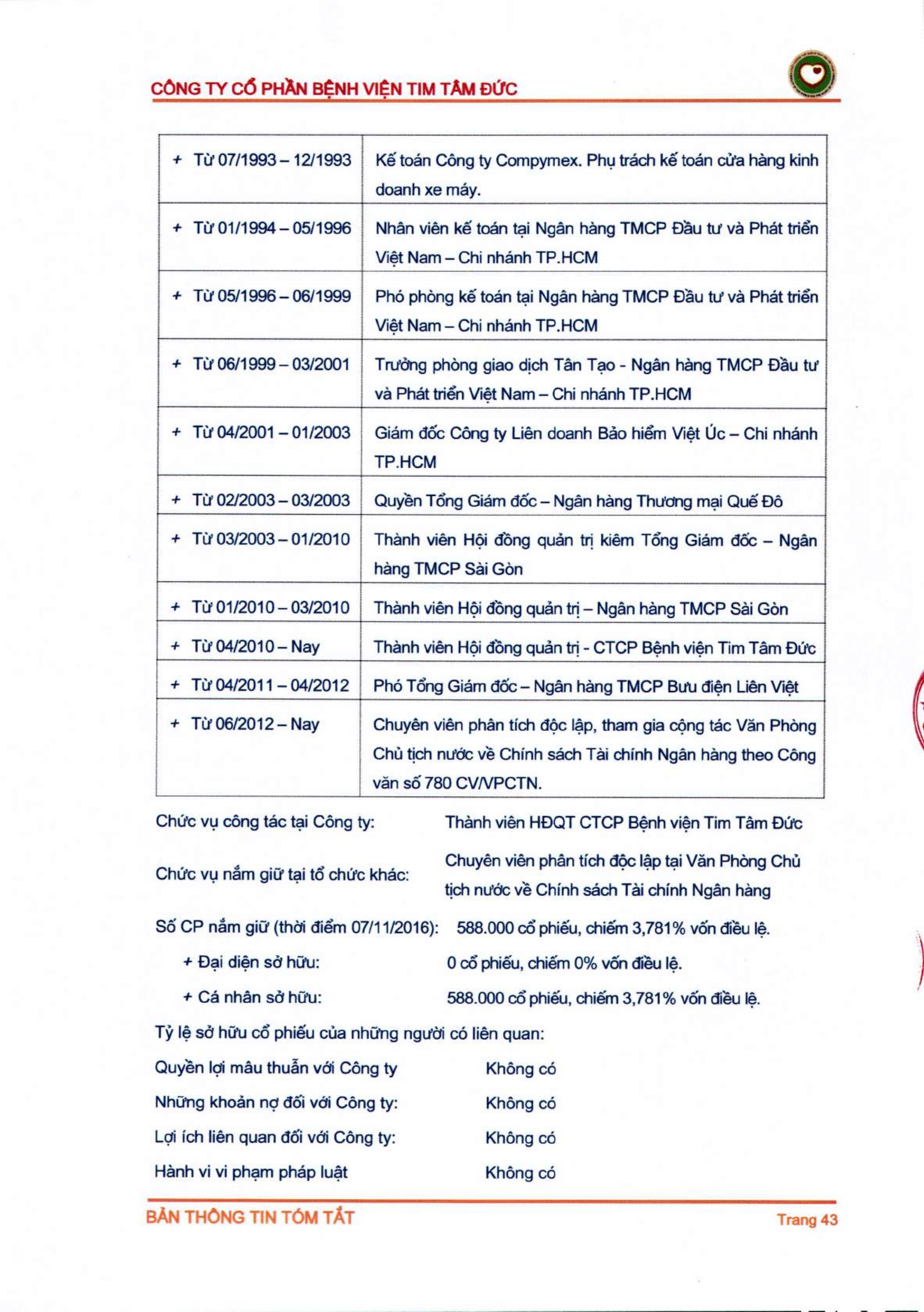 Thông tin tóm tắt về tổ chức đăng ký giao dịch Công ty CP Bệnh viện Tim Tâm Đức