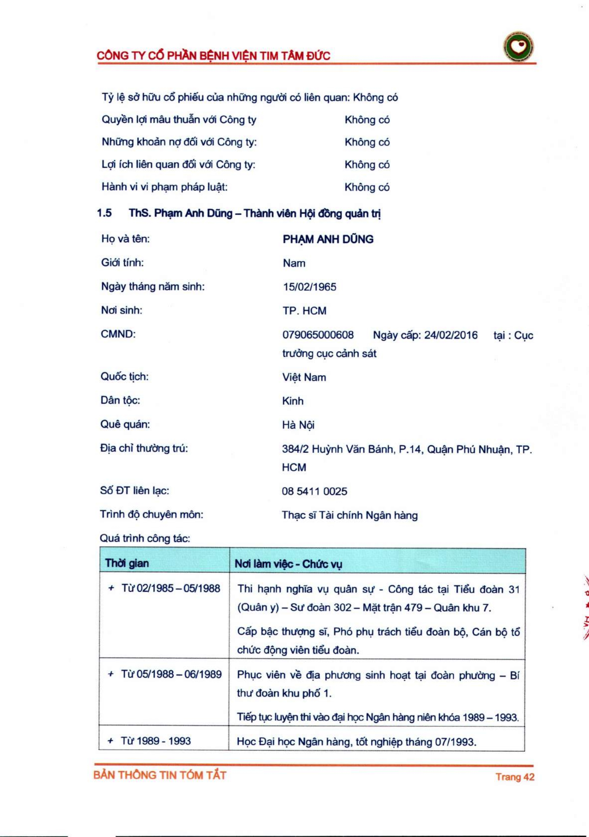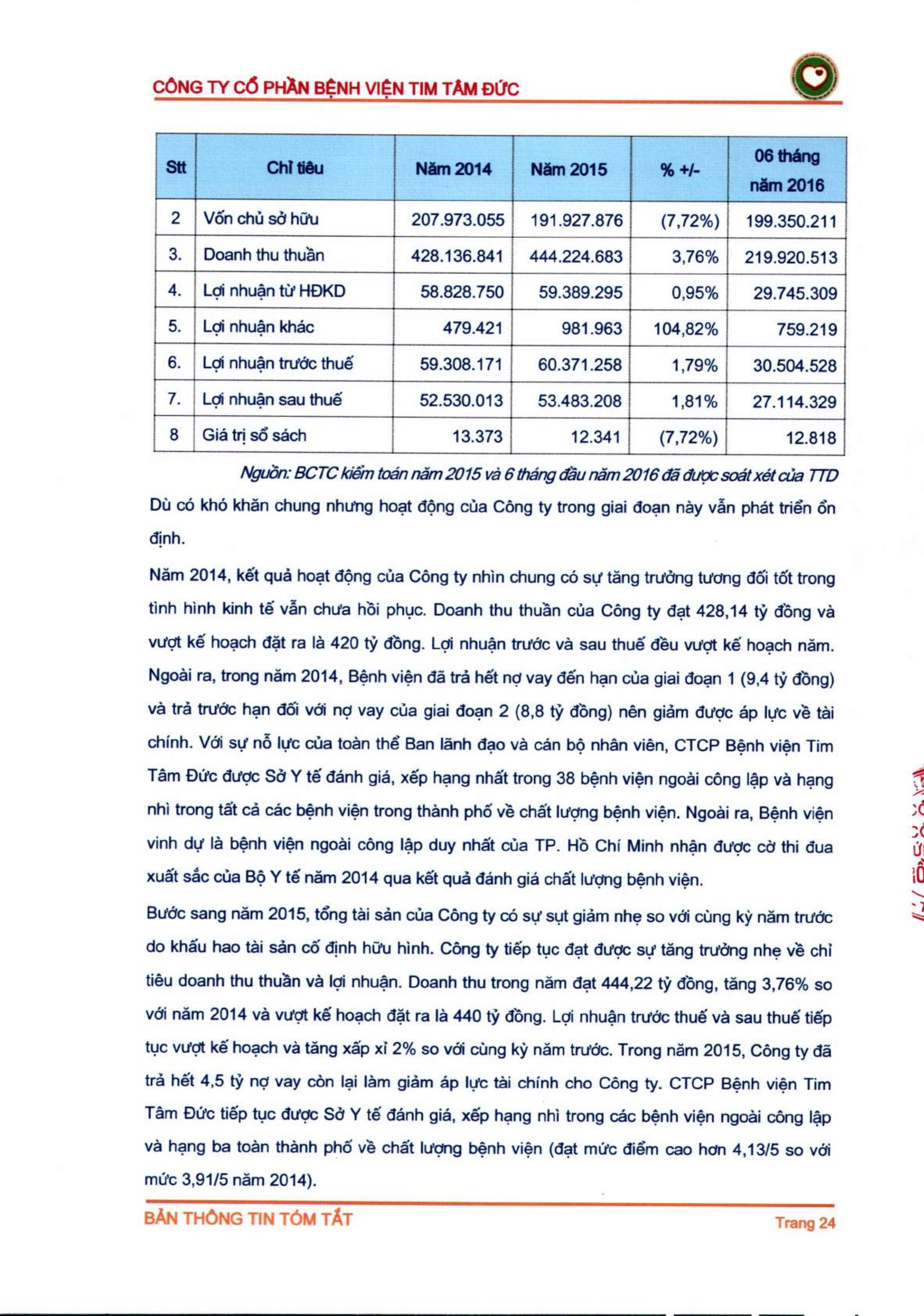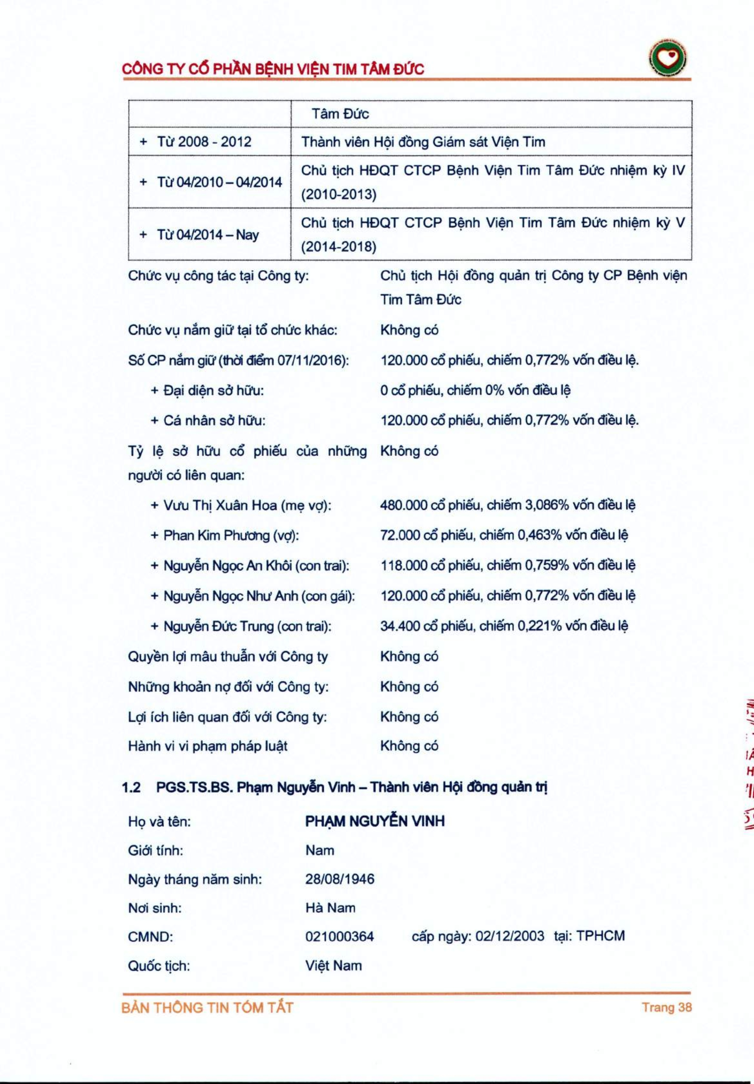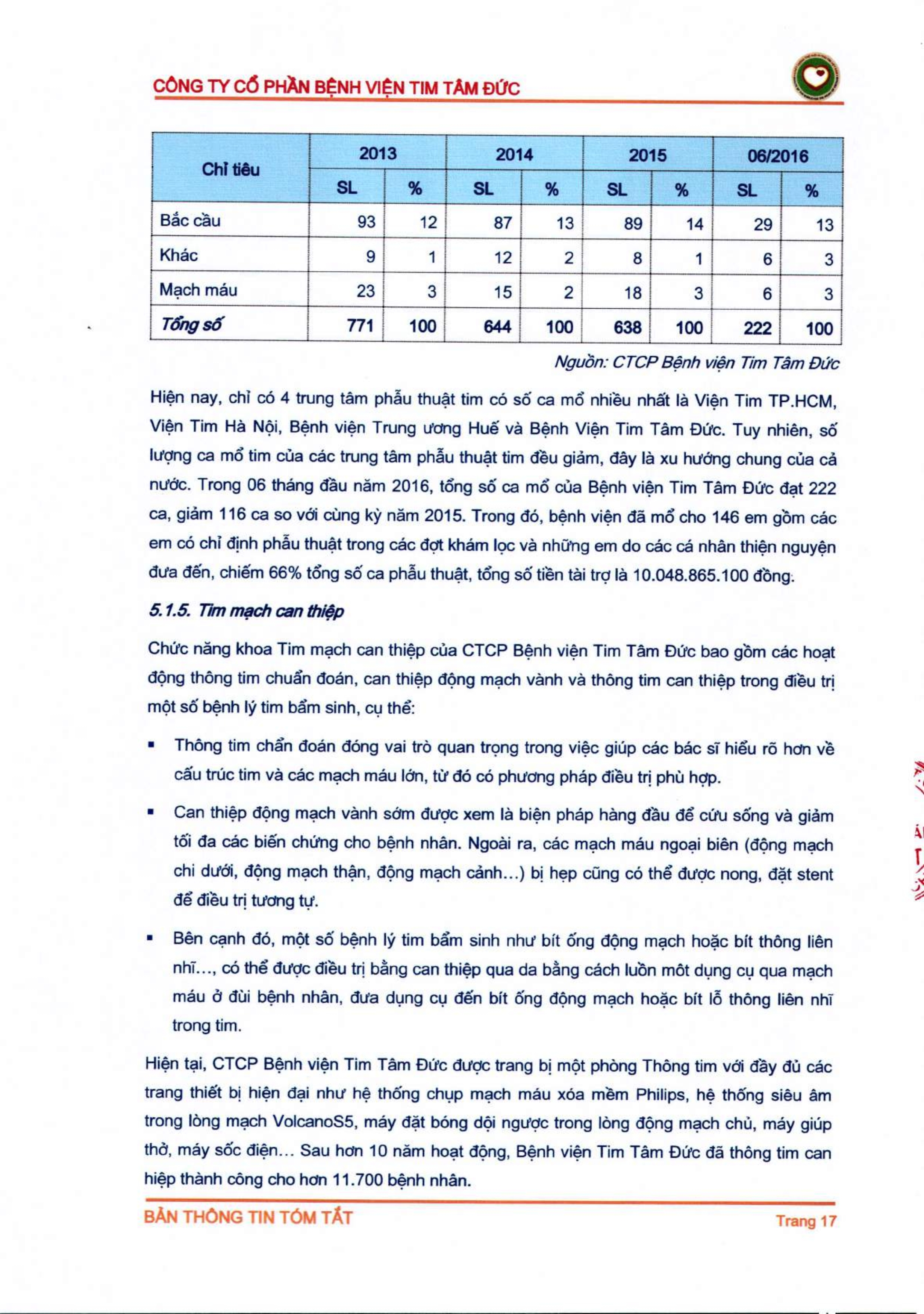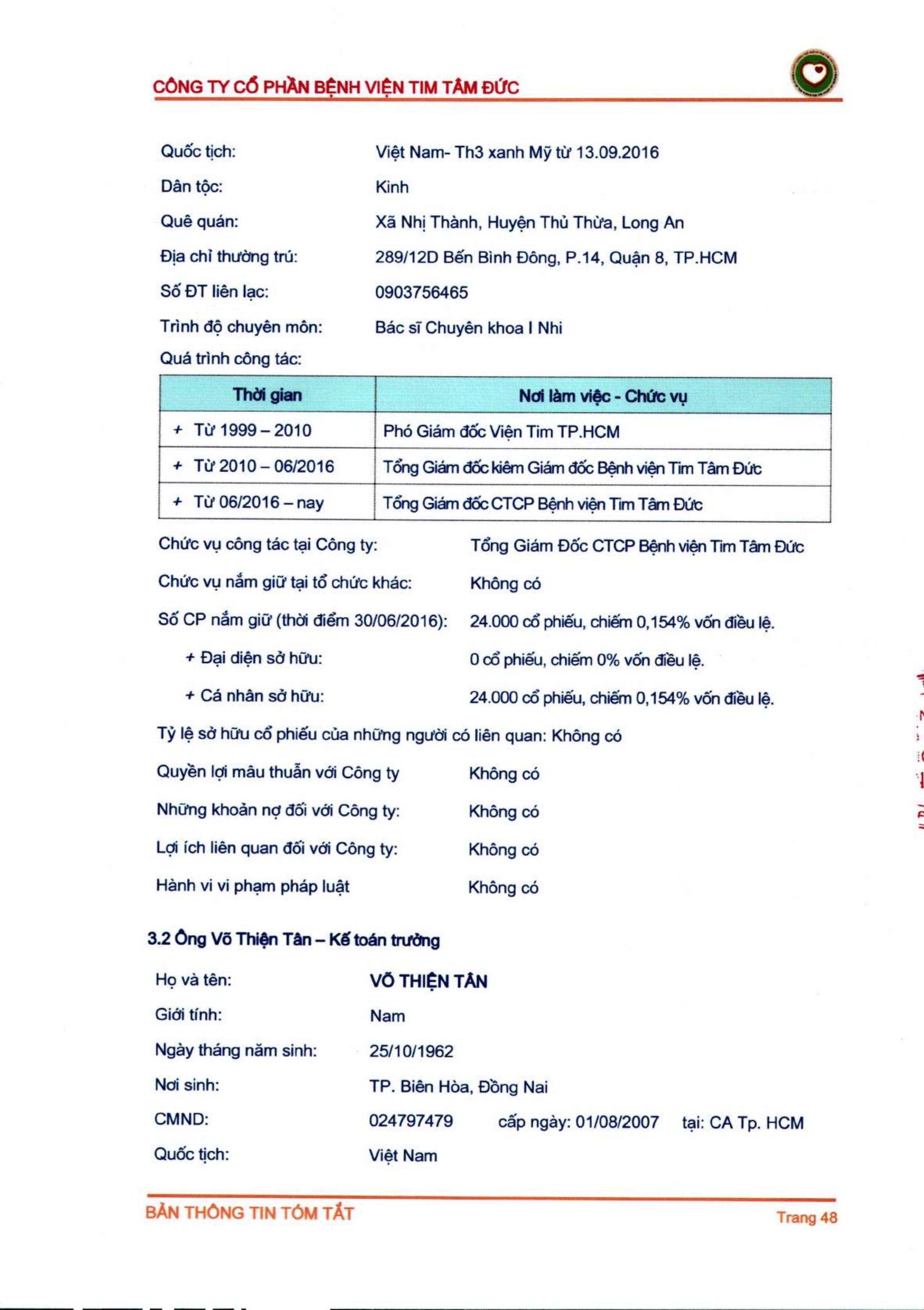Thông tin tóm tắt về tổ chức đăng ký giao dịch Công ty CP Bệnh viện Tim Tâm Đức