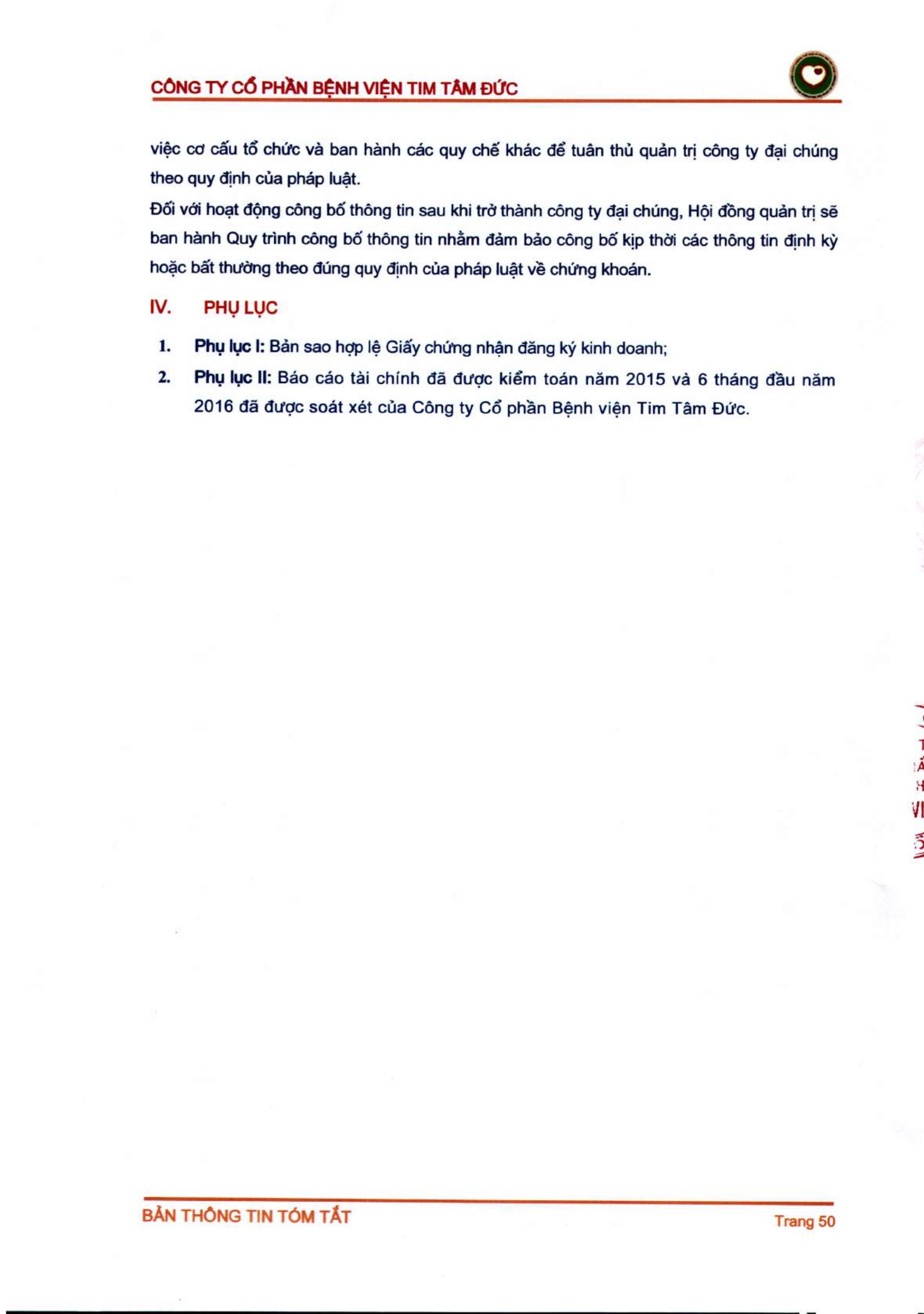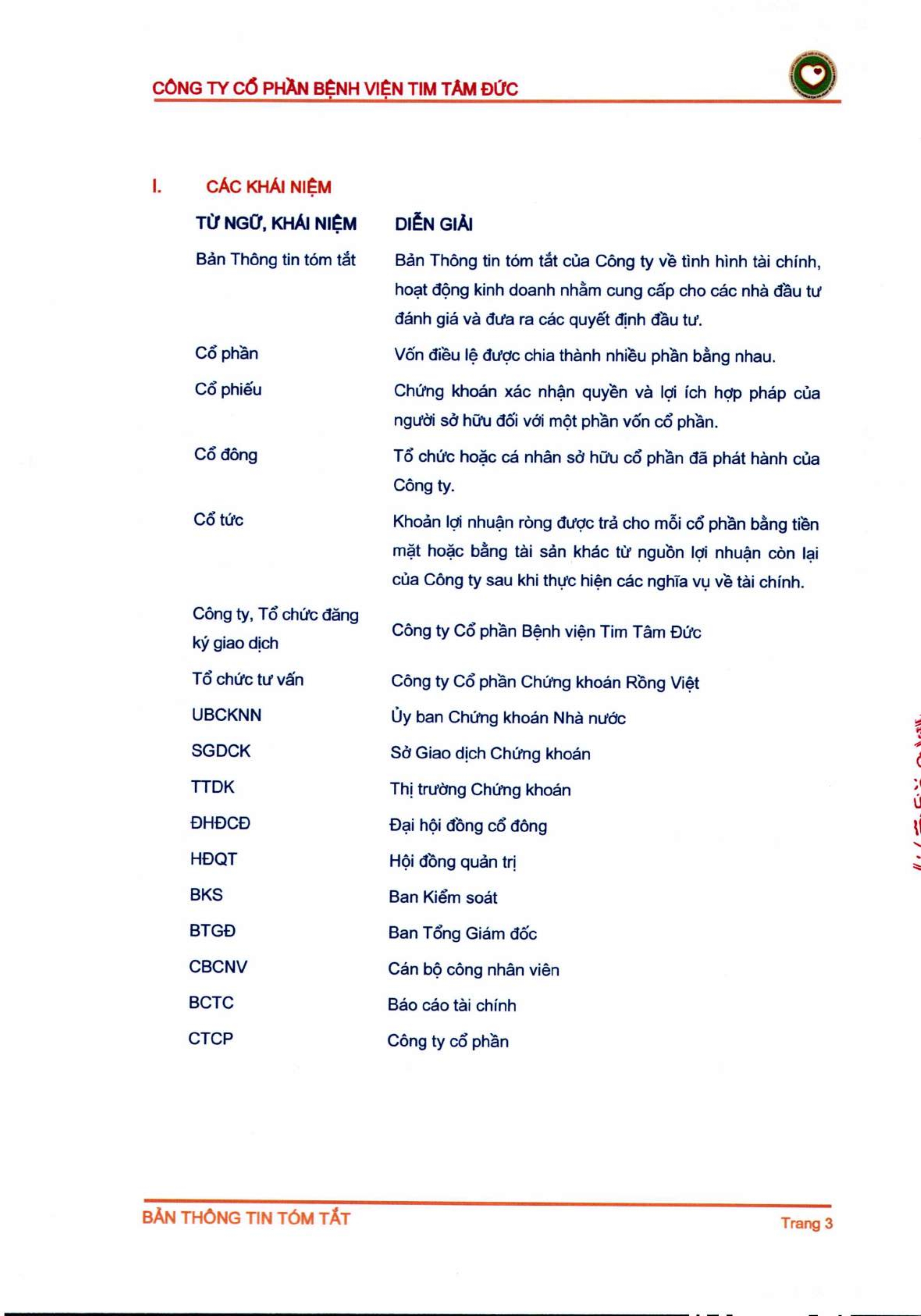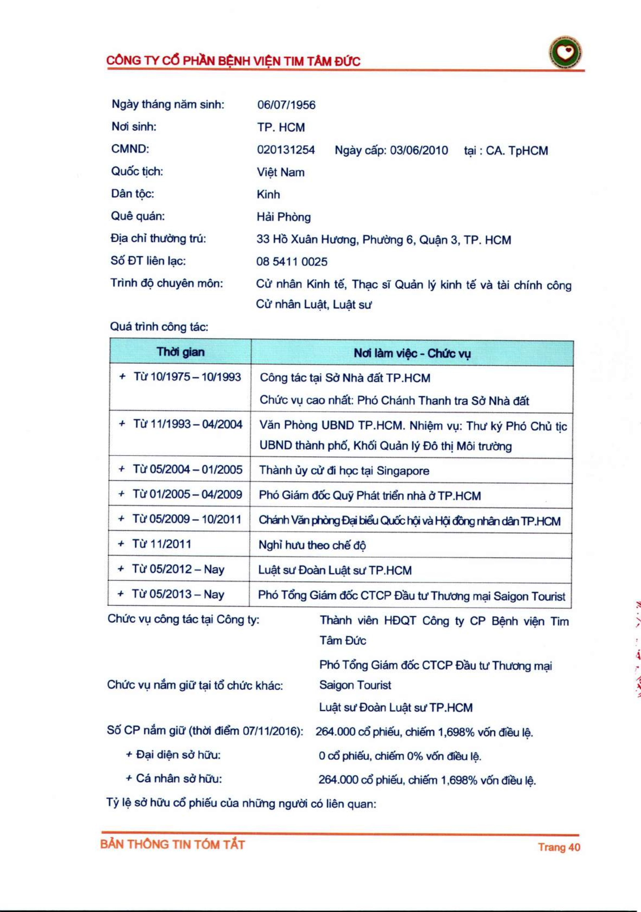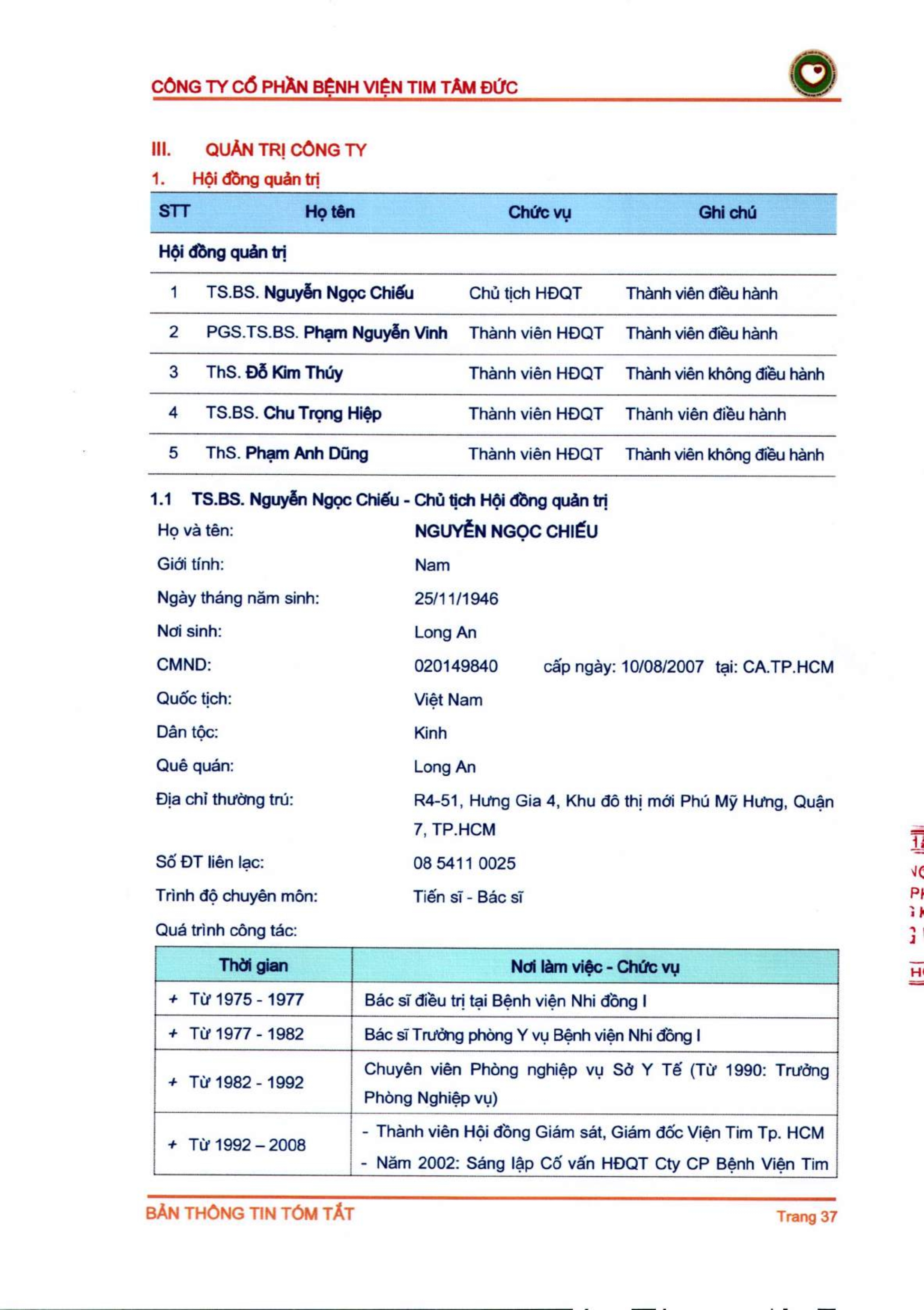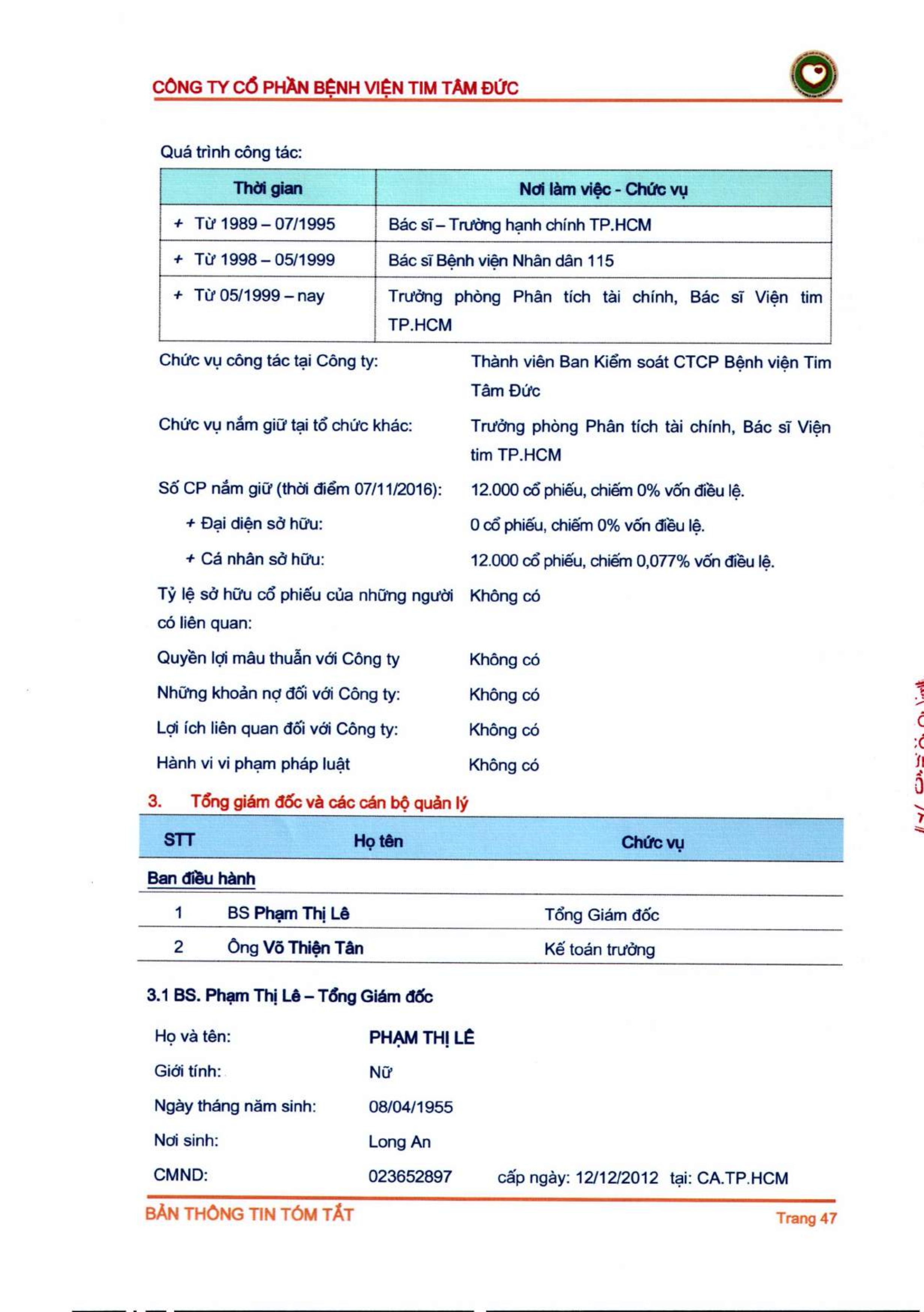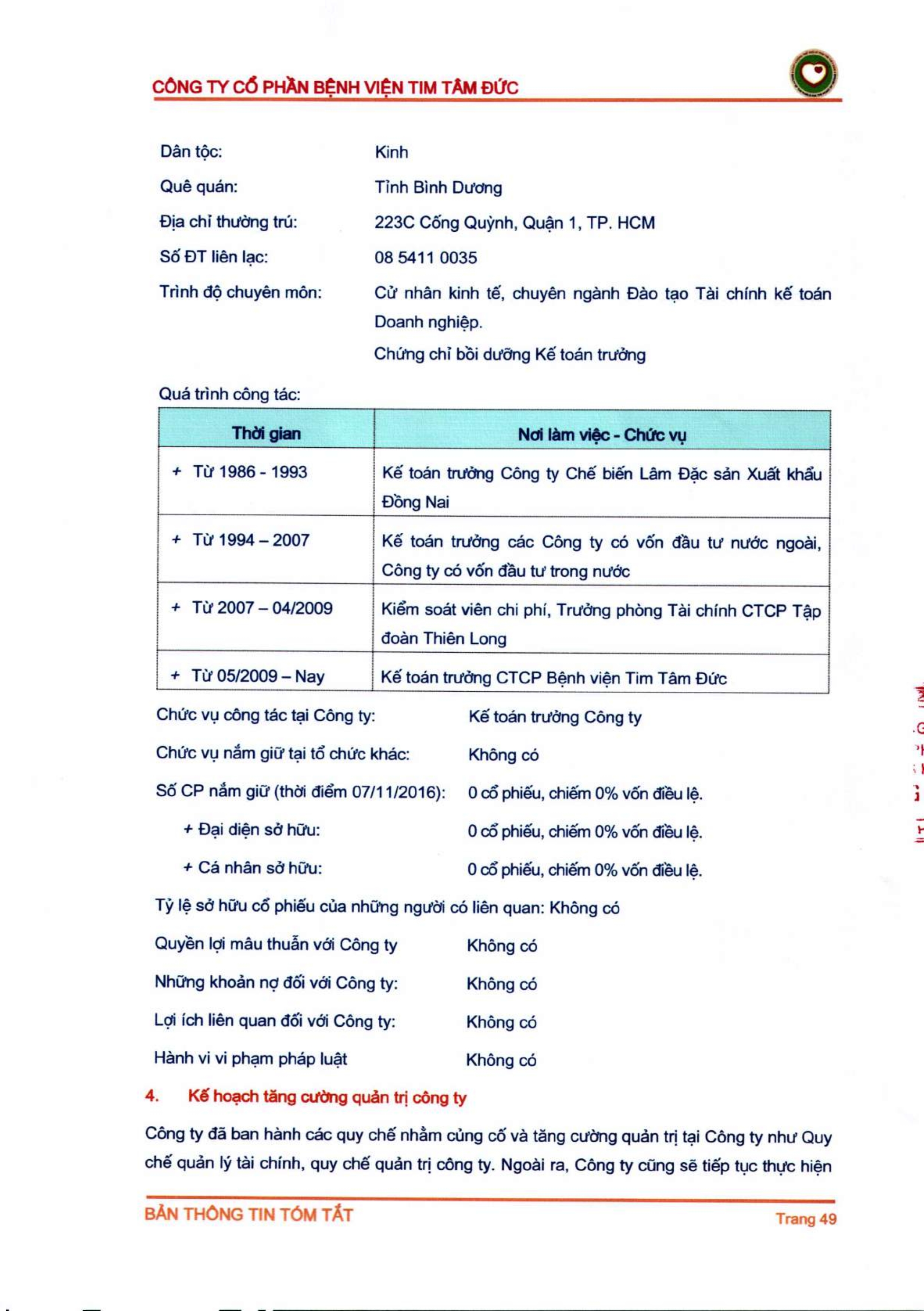 Thông tin tóm tắt về tổ chức đăng ký giao dịch Công ty CP Bệnh viện Tim Tâm Đức