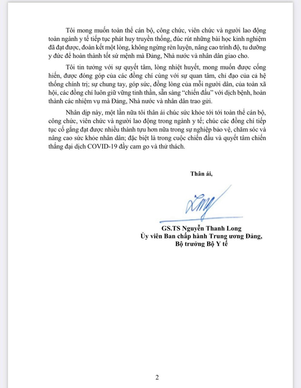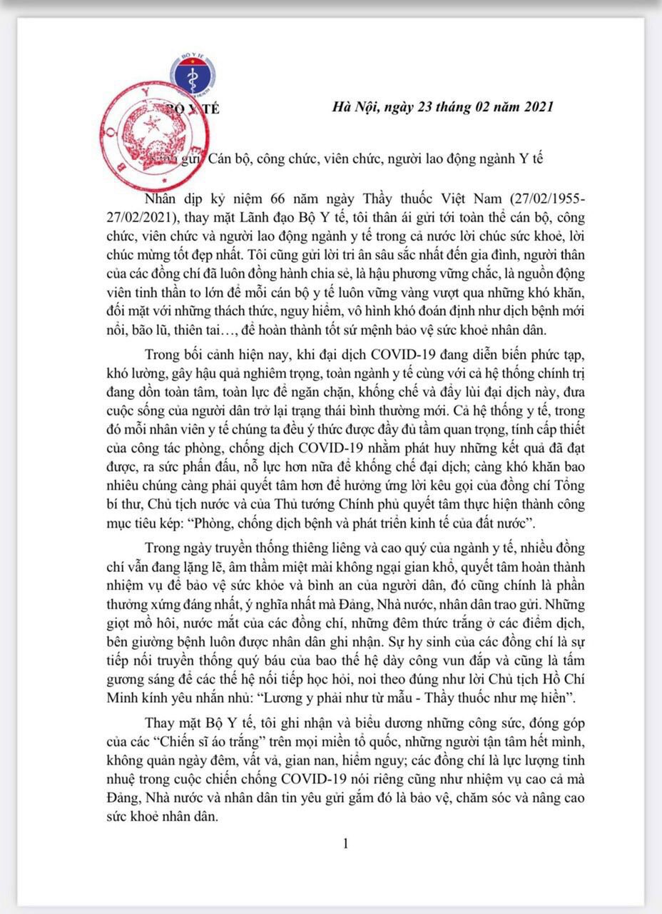 Ngày 23/02/2021, Bộ trưởng Bộ Y tế GS.TS Nguyễn Thanh Long đã gửi thư chúc mừng các bộ, công chức, viên chức ngành Y tế nhân kỷ niệm 66 năm ngày Thầy thuốc Việt Nam (27/02/1955 – 27/02/2021).